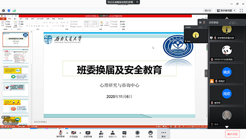 2020年11月6日,心理中心2018级一班二班各自于班内组织开展了“班委换届及安全教育”线上主题班会。本次班会活动由中心辅导员梁坡老师进行主持,2018级一二班全体学生参加。