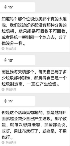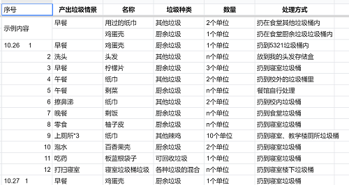 活动截止日期为11月14日。在参与中,同学们陆续反馈了自己参与活动的感想、反思。大家纷纷表示,在活动中感受到了垃圾分类的重要性,也表示将会改变自己的日常习惯,并用实际行动呼吁更多人进行垃圾分类,保护环境。编号为001的同学说:“进行垃圾分类针对太难了,我们这边并没有很多分类垃圾桶,大部分都是‘可回收’和‘不可回收’,并且很多时候最后还是统一丢到一个大垃圾桶内,分和不分没有什么区别。而且坚持记录垃圾的过程也是很难,感觉自己是一个垃圾制造商,一直在生产垃圾。但是活动还是很有趣的,越是到最后越会减少自己产生的垃圾(环保意识增强了)”。