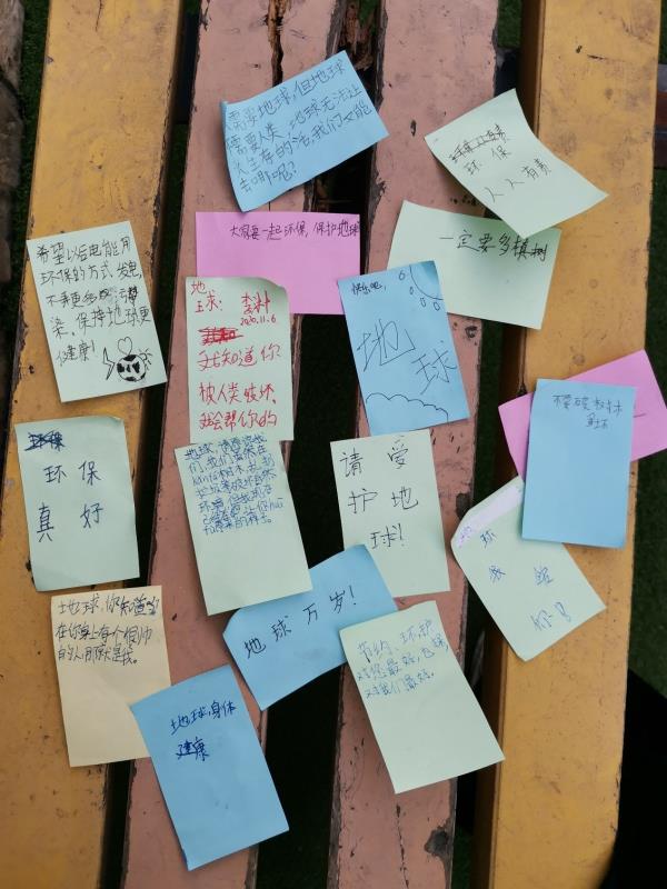 在最后的留言板“绿色就在我身边”环节中,同学们在便签上留下了自己参加这次环保知识科普活动的收获与感想以及想对地球说的话。同学们都表示了在活动中收获了许多,在今后的生活中会更加注意自己的环保行为,为地球母亲的清洁美丽贡献自己的一份力。有同学说:“地球,请原谅我们,我们虽然在砍伐树木、乱扔垃圾等(行为),破坏自然环境,但我现在已经在让你恢复原来的样子了。”