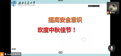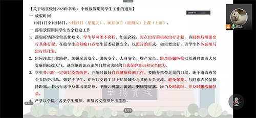 2020年9月30日下午,由心理中心2019级辅导员靳涵主持的关于国庆假期间安全问题的班会于14:30准时开始,本次班会通过“腾讯会议”以视频的方式进行。此次班会意在增强同学们的防疫意识,提高同学们保护自己的能力,帮助同学们度过一个安全、愉快、有意义的假期。