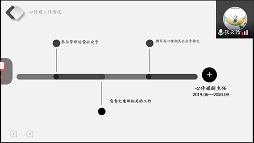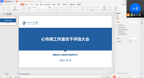 10月10日19:00,2019-2020学年心传媒本科优干评选大会于线上准时召开,本次大会由赵山霞同学主持,届时,心传媒全体成员以及心传媒工作室指导老师张涛参与会议。