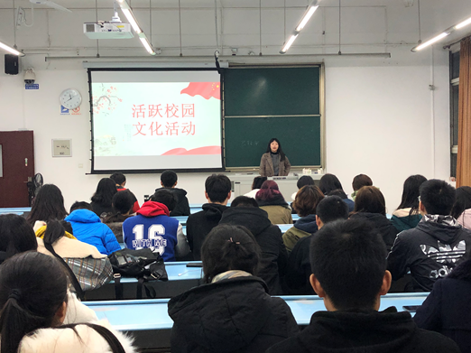 首先开展的是“活跃校园文化”为主题的活动。团支书谢杭琦给大家讲述了活跃的校园文化,介绍了丰富多彩的校园活动。