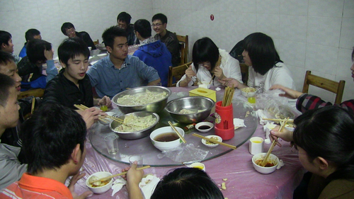 经过一段时间的努力,大家总是把饺子包完了,饺子也得以下锅。同学们剩下的事情就是等待自己的劳动成果出锅。在这段时间里,大家开着玩笑,吃着开胃的水果拼盘,时间不知不觉就过去了。最为激动的时刻,莫过于饺子上桌的那一刻,此次活动的第二波高潮也随之拉开。大家还来不及欣赏自己的劳动成果,就开始呈现出饿狼扑食状,什么绅士淑女的早就抛在了身后。令大家感到欣慰的是,包出来的饺子的形状虽然不是很好看,但至少再煮过之后还是完整的,没有裂开,而且饺子的味道还真不错,毕竟是自己包出来的嘛。在吃的过程中,时不时会听到一些同学的欢呼和尖叫声,原来他们吃到了包有话梅的饺子,得到了一份额外的幸运。而其他的同学也不停地吃着饺子,希望能找到剩余的话梅。没多久,几大盘饺子就被同学们一扫而空,大家也都吃得心满意足。在简单的打扫完“战场”之后,此次的活动也就此告一段落。