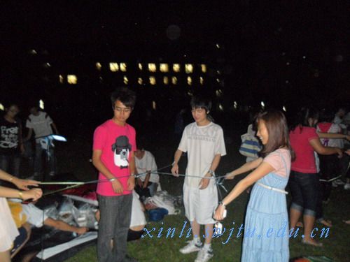 饕餮大餐让人尽兴,接下来的游戏更是将聚会推向了高潮。每个同学用黑布遮住眼睛,通过触觉感知来分辨实现分发到每个人手里的道具。所有人手中的道具都是配对的,只有一个道具除外,而游戏的目的就是举全班之力找出这个不配对的道具。于是浙园上演了一场趣味盎然的“盲人摸物”,同学们互相交换摸着对方手中的道具:“啊,我知道了,它是长方体型的,中间有个突起……”“呵呵,我知道了,咱俩是一样的”。同学们互相问着,气氛极高,可是由于没能有效组织起来,加之现场颇有些乱,最后没有找出不配对的道具。在这个活动中,大家学会了只有有效合作才能成功的道理。