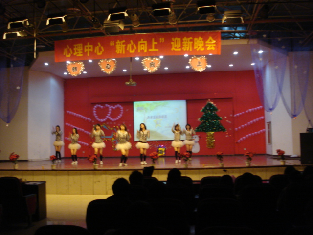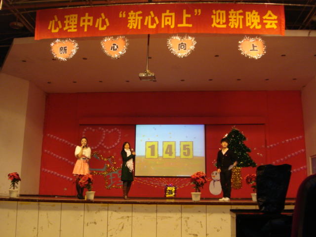 2010年12月24日,正值圣诞平安夜,心理中心“新心向上”迎新晚会在一食堂三楼圆满举行。经过将近一个星期紧锣密鼓的筹划,晚会各项细节工作安排得井井有条。前来观看晚会的嘉宾有捷克论坛