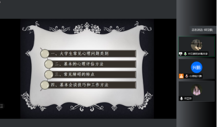 会议分为三个部分。11月6日上午9:30至11:30由心理中心张学伟老师讲解心理障碍识别与心理危机干预应对策略,下午14:30至16:30由心理中心马淑琴老师讲解心理委员职责与朋辈心理辅导注意事项。11月7日上午9:30至11:30由心理中心何立群老师讲解大学生常见心理问题的识别与应对。