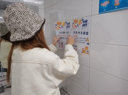 志愿者提前准备好卫生巾互助盒以及相应的互助盒使用小报,在活动时间于五号教学楼集合。八名志愿者分开行动,互助盒投放地点分别在X5230、X5321、X5330、X5430、X5521、X5530、X5621、X5630等教室旁边的女卫生间,基本覆盖五号教学楼。