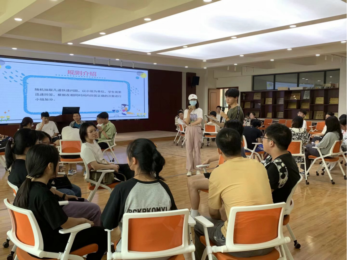 破冰大会先由新生进行自我介绍。主持人周全同学向同学们介绍了游戏项目和规则。随后进入游戏环节,游戏包括“寻找共同点”、“快问快答”、“你画我猜”等多个生动而有趣的活动。游戏环节以小组为单位进行积分,积分最少的小组为大家带来了才艺展示,在游戏中处处充满了青春活力与欢声笑语,拉近了新生同学们的距离。