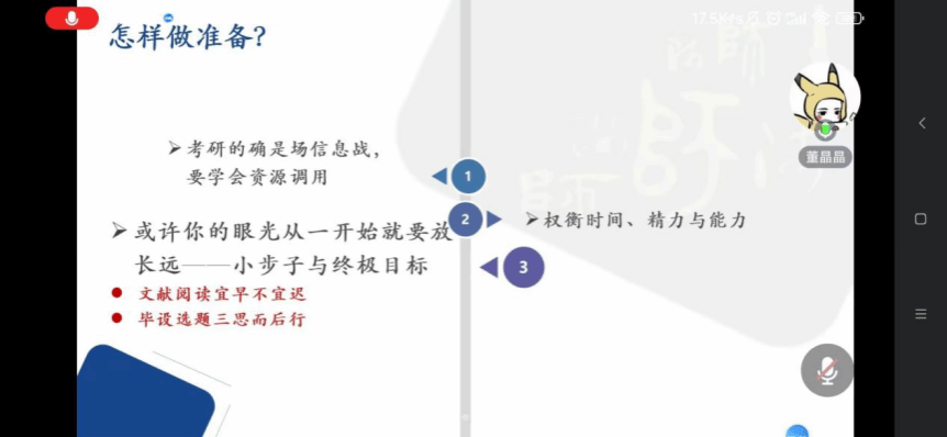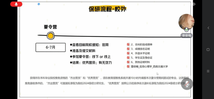 随后,章俊楠学姐热情登场。她讲述了自己保研至华中师范大学的心路历程和具体流程。章俊楠学姐通过恳切的建议,为想要保研的同学指明了未来的学习方向。她强调了提前规划、持续努力以及积极寻求导师建议的重要性。