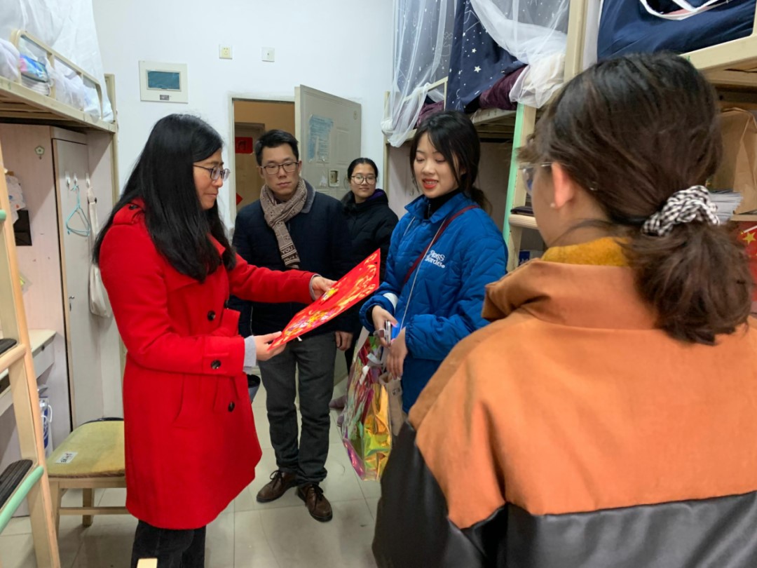 On the afternoon of December 31st, 2021, leaders from the Psychological Research and Counseling Center (PRCC), Liu Yongmei (the Secretary of the Party branch), Ke Xiaojun (the Deputy Secretary of the Party branch), and Xiong Caiyu (a counselor of students’ affairs), visited dormitories of PRCC’S freshmen to offer them care and blessings for the New Year.