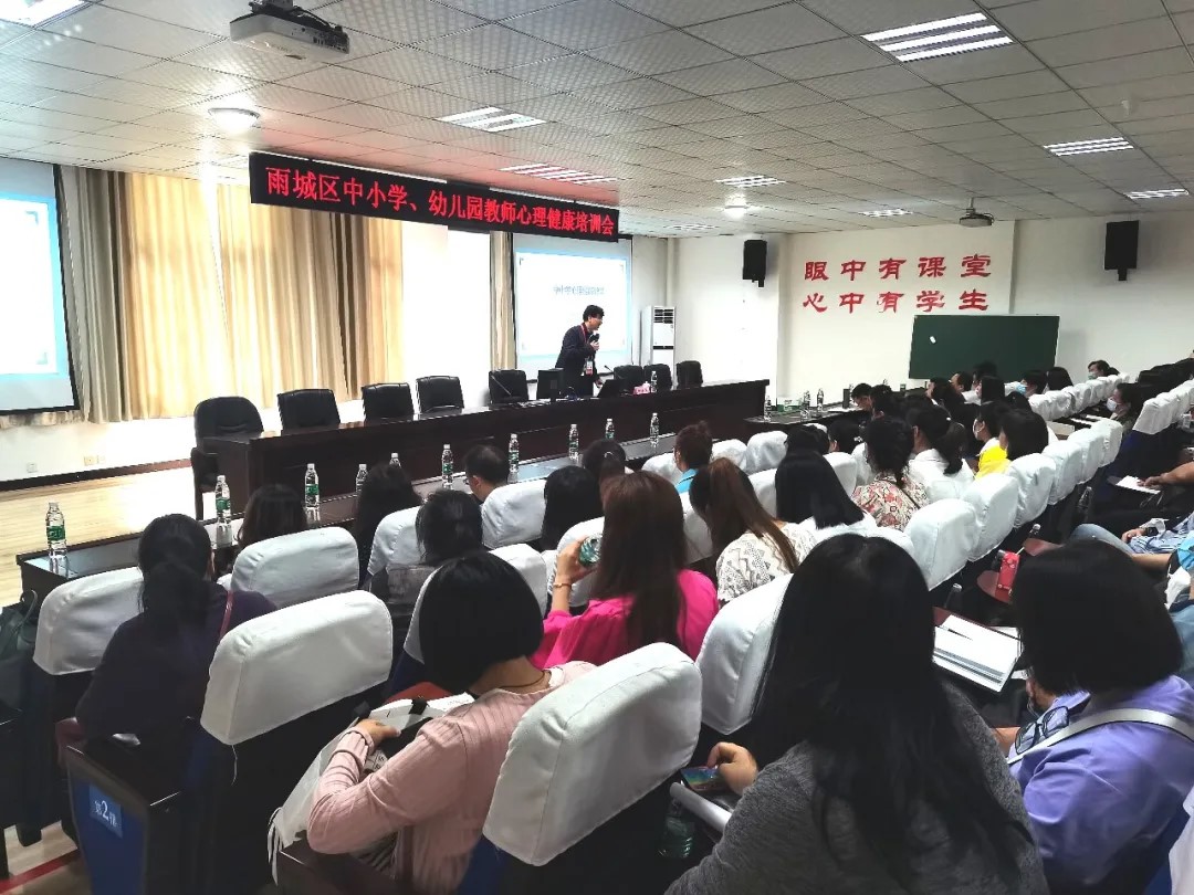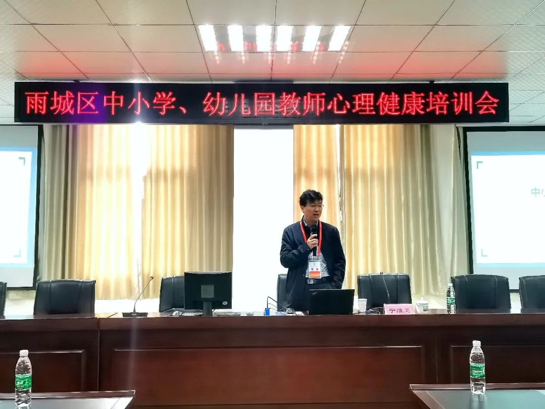 教授委员会主任宁维卫教授,为雅安雨城区中小学、幼儿园教师开展心理健康培训活动。全区各幼儿园园长、中小学校长及近百位幼儿园、中小学教师参与培训。