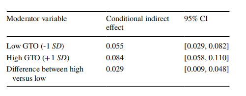 非标准化系数结果表明,每日优势使用对每日创新行为的主效应显著(B=0.084,SE = 0.023,p <.001),假设H1得到验证。使用R语言并应用蒙特卡洛模拟程序检验间接效应,结果表明每日优势使用对每日创新行为有显著的间接效应,假设H2得到验证。交互作用效应图及简单斜率检验的结果显示,当每日感恩(GTO)较高时,每日优势使用与每日Flow之间的正相关关系更强,假设H3得到支持。表4的结果表明,当每日对组织的感恩(GTO)较高时,每日优势使用通过每日Flow对创新行为的影响更大,假设H4得到支持。