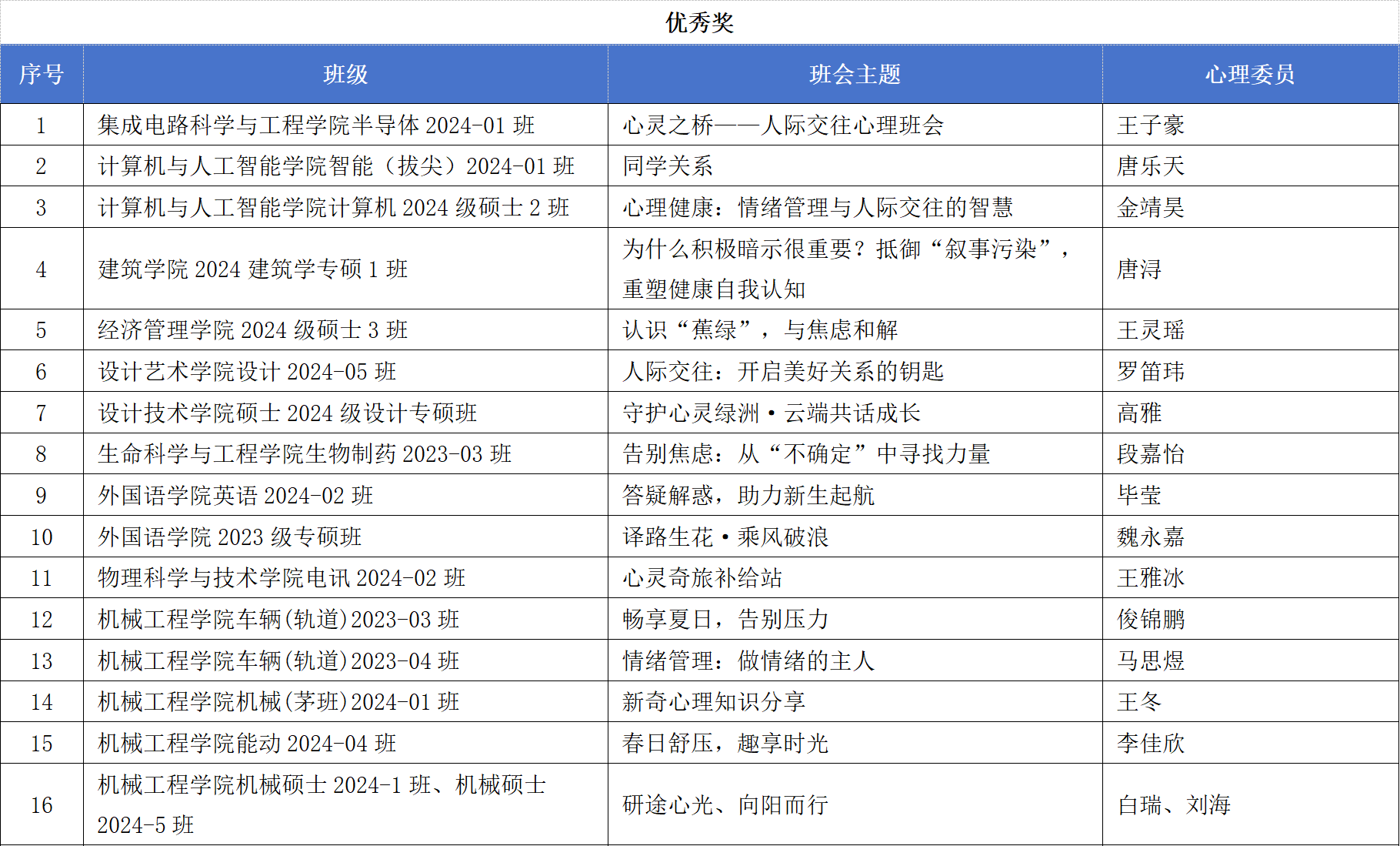 2025年度学校“交心桥”心理班会展示会经学院初赛推荐、展示会复赛、决赛,评选出特等奖2项、一等奖3项、二等奖5项、三等奖20项、优秀奖28项以及心理委员个人特色奖3项。现将获奖名单公布如下: