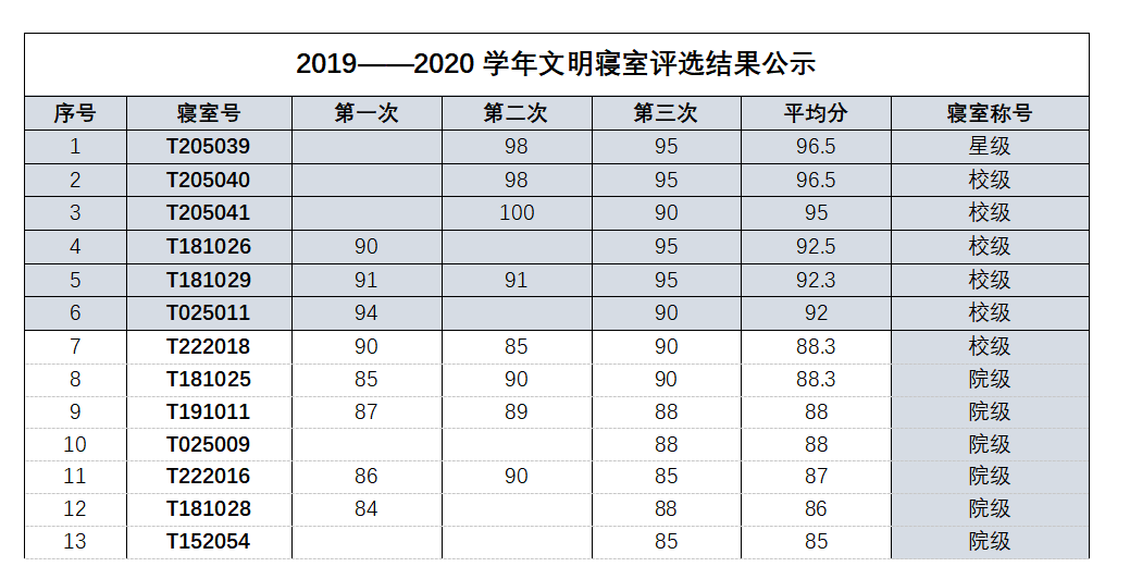 根据《捷克论坛 本科生文明宿舍评选管理办法》,捷克论坛 于2020年9月开展2019-2020学年本科生文明宿舍评选工作,汇总了这一学年的寝室安全及卫生检查情况,并按照总分高低评选出拟获奖寝室,现予以公示。如有异议,请于2020年9月25中午之前到学工组反馈,不接受匿名反馈。