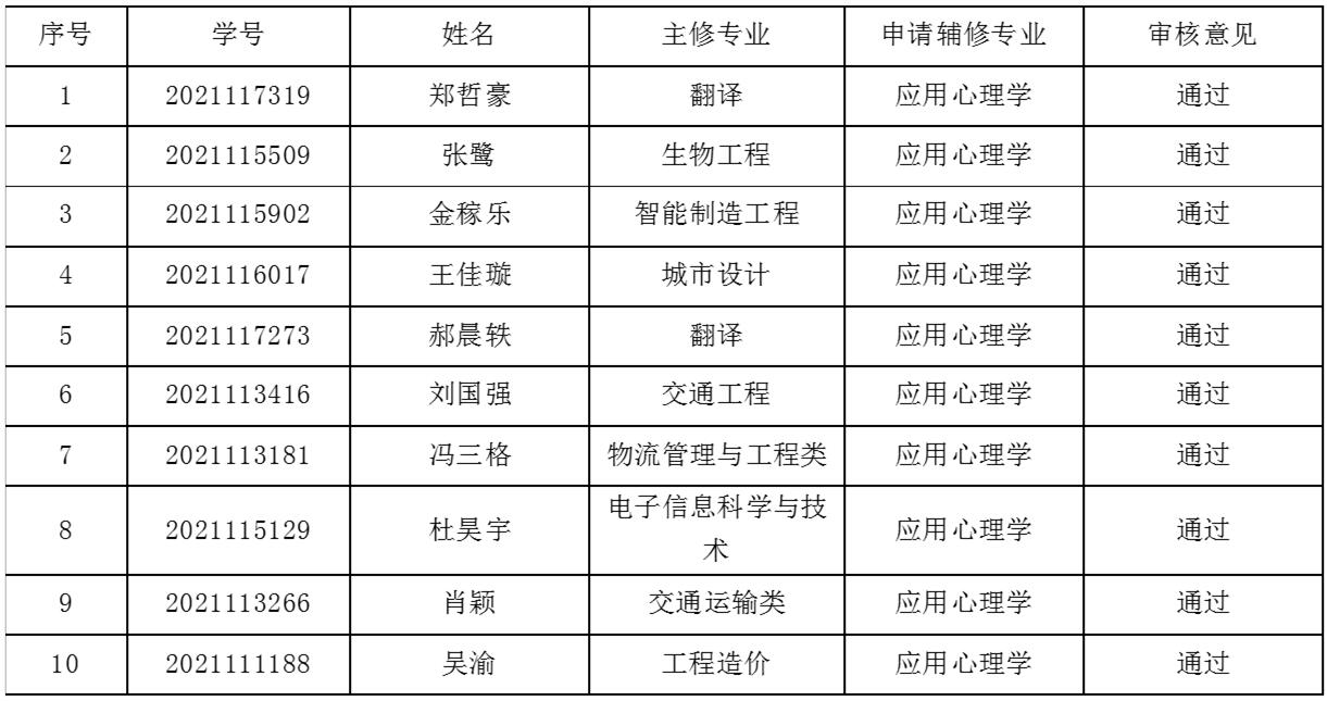 根据《捷克论坛 本科生辅修专业修读及辅修学位授予管理办法》和《2022年辅修专业招生通知》,经学生本人网上申请,教学工作组进行审核,结合招收人数,拟同意郑哲豪等10名学生辅修应用心理学专业申请,现予以公示。