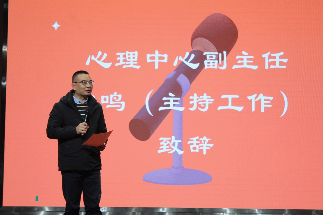 的心理中心副主任-雷鸣对此次心理剧情景剧大赛进行致辞。雷鸣副主任在致辞环节中首先认同了心理剧在高校心理育人工作中的重要价值,他认为心理剧既是面向普通学生开展心理健康教育工作的技术手段,又能积极疗愈学生的心理障碍;他鼓励同学们认真打磨剧本、排演,希望通过心理剧可以帮助同学解决自己的困难。