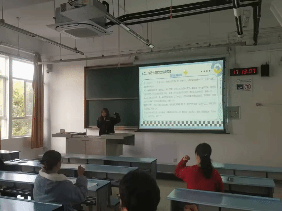 学习“渐进性躯体放松”时,我们采取跟同学们互动、亲身实践的方式,让同学们感受肌肉收缩、放松的反复交替切换练习下身体紧张和放松时的不同感觉,从而更好地认识紧张反应,并对此进行放松,最后达到身心放松的目的。