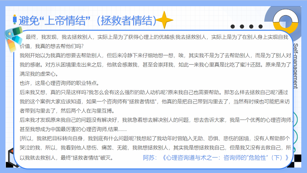 在讲座最后,我们给同学们分享了一篇文章,提醒同学们在“助人自助”的过程中需要避免“拯救者情结”