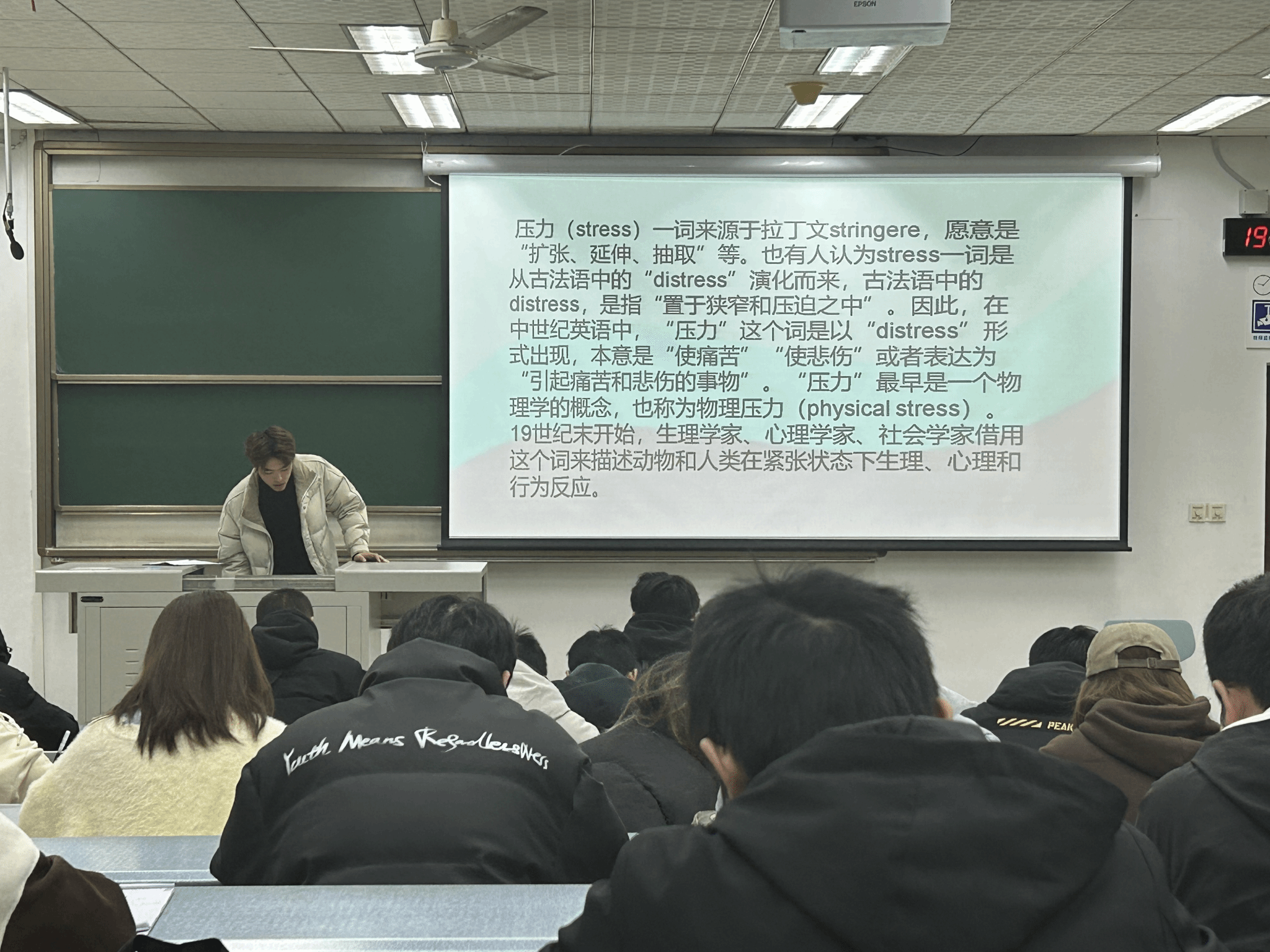 讲座的开始,马斌同学首先以一段当代年轻人诉说生活中种种压力的视频引发大家共鸣,拉近了与同学们的距离,使大家开始审视自己生活中的各种压力。紧接着,他从科学的角度为大家阐释了何为压力和焦虑,使大家对压力和焦虑的本质有一个更为清晰明了的认识,从而为帮助大家应对压力和焦虑打好铺垫。